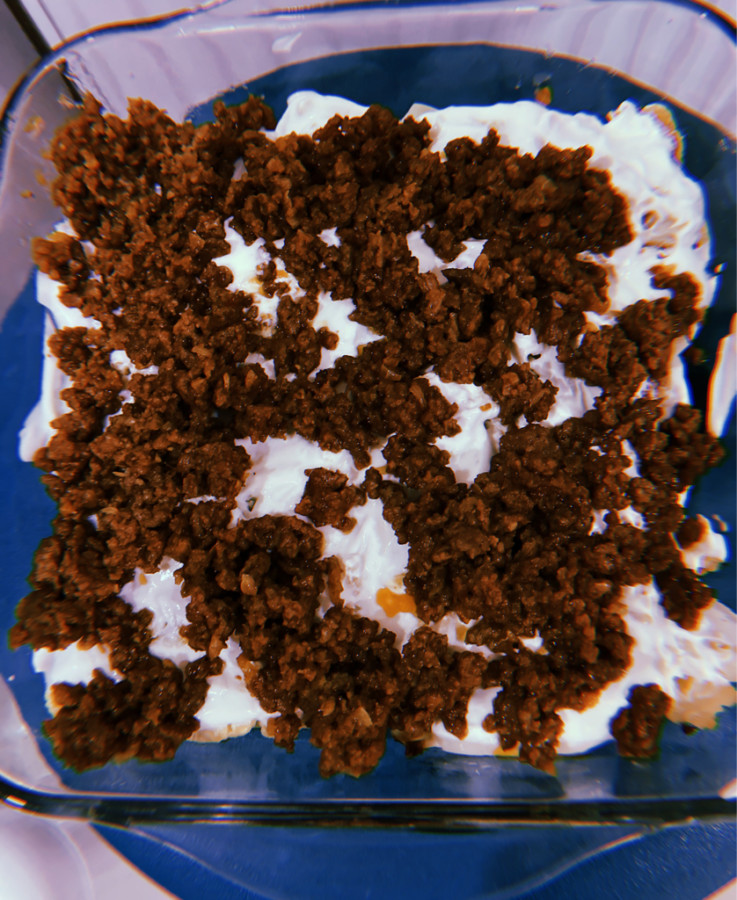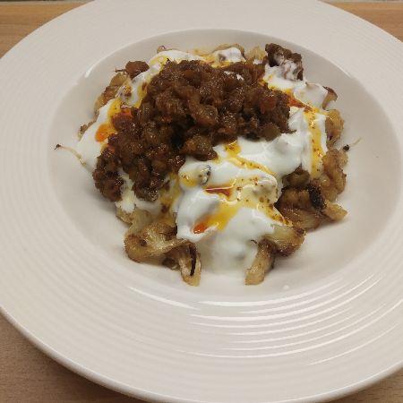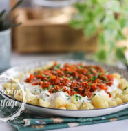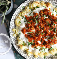 - Üzerine önce sarımsaklı yoğurt, ardından kıymalı sosu gezdirin,