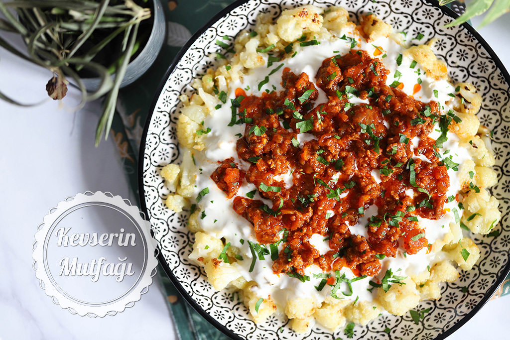 Karnabaharı fırında pişirmek yerine haşlayabilirsiniz de. Ama ne kadar iyi süzerseniz süzün servis tabağına aldığınızda su saldığı için birkaç dakika içinde tabağın kenarında sulu-yoğurtlu göze hoş görünmeyen bir görüntü oluşturuyor. Küçük bir ayrıntı belki ama benim gibi yemek yemeye sadece karın doyurmak olarak bakmayan insanlar için önemli. Fırında da haşlanmış kadar yumuşacık oluyor karnabaharlar. Üstelik karnabaharları fırına verdikten sonra diğer aşamalara başladığınızda, kıymalı sos ve sarımsaklı yoğurdunuz hazır olduğunda karnabaharlar da tam olarak pişmiş oluyor.