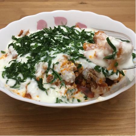 - Üzerine önce sarımsaklı yoğurt, ardından kıymalı sosu gezdirin,