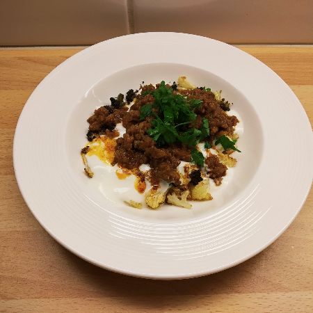 Karnabaharı fırında pişirmek yerine haşlayabilirsiniz de. Ama ne kadar iyi süzerseniz süzün servis tabağına aldığınızda su saldığı için birkaç dakika içinde tabağın kenarında sulu-yoğurtlu göze hoş görünmeyen bir görüntü oluşturuyor. Küçük bir ayrıntı belki ama benim gibi yemek yemeye sadece karın doyurmak olarak bakmayan insanlar için önemli. Fırında da haşlanmış kadar yumuşacık oluyor karnabaharlar. Üstelik karnabaharları fırına verdikten sonra diğer aşamalara başladığınızda, kıymalı sos ve sarımsaklı yoğurdunuz hazır olduğunda karnabaharlar da tam olarak pişmiş oluyor.
