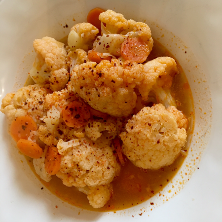 Yemekleri genel olarak sulu sevmem, o yüzden olabildiğince az sulu yaparım. Kullandığım malzemenin tüm aroması az miktarda suyun içine hapsolduğu için konsantre bir aroması olur yemeğin. Karnabahar pek su salan bir sebze olmadığı içi karnabahar için geçerli değil ama diğer sebzelerde de sebzeleri olabildiğince kendi suyunda pişirip lezzetlerinin seyrelmemesini sağlamaya çalışırım.