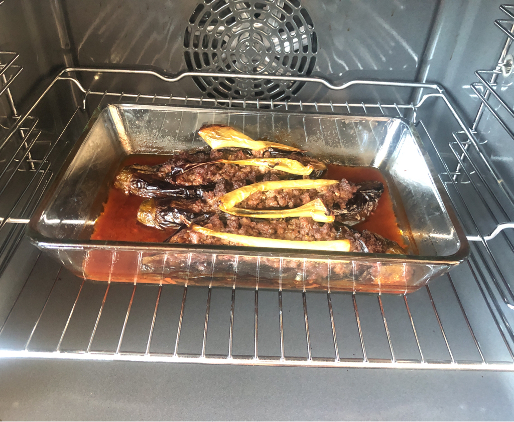 - Kıymalı harcı patlıcanlara paylaştırın,
