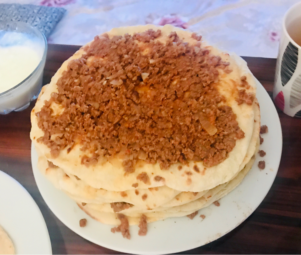 - Üzerine bir lavaş daha koyup yine kıymalı harçtan yayın,