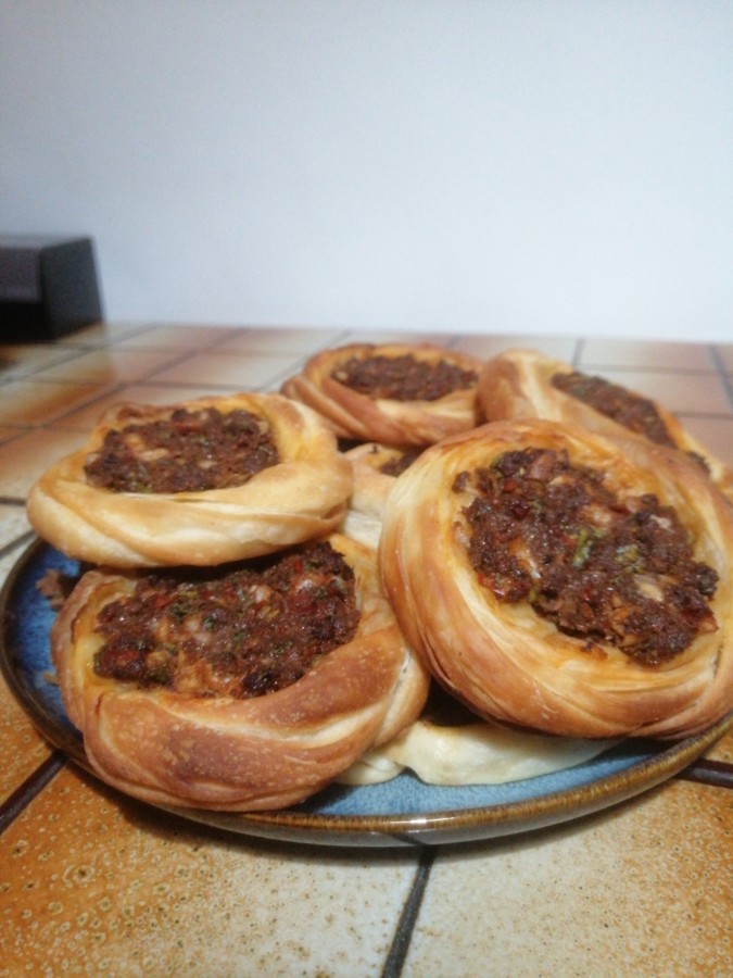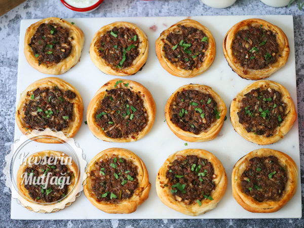 - Kıymalı harcı 12 eşit parçaya bölüp her bir parçayı hamurların üzerine yerleştirin ve bastırarak düzleyin,