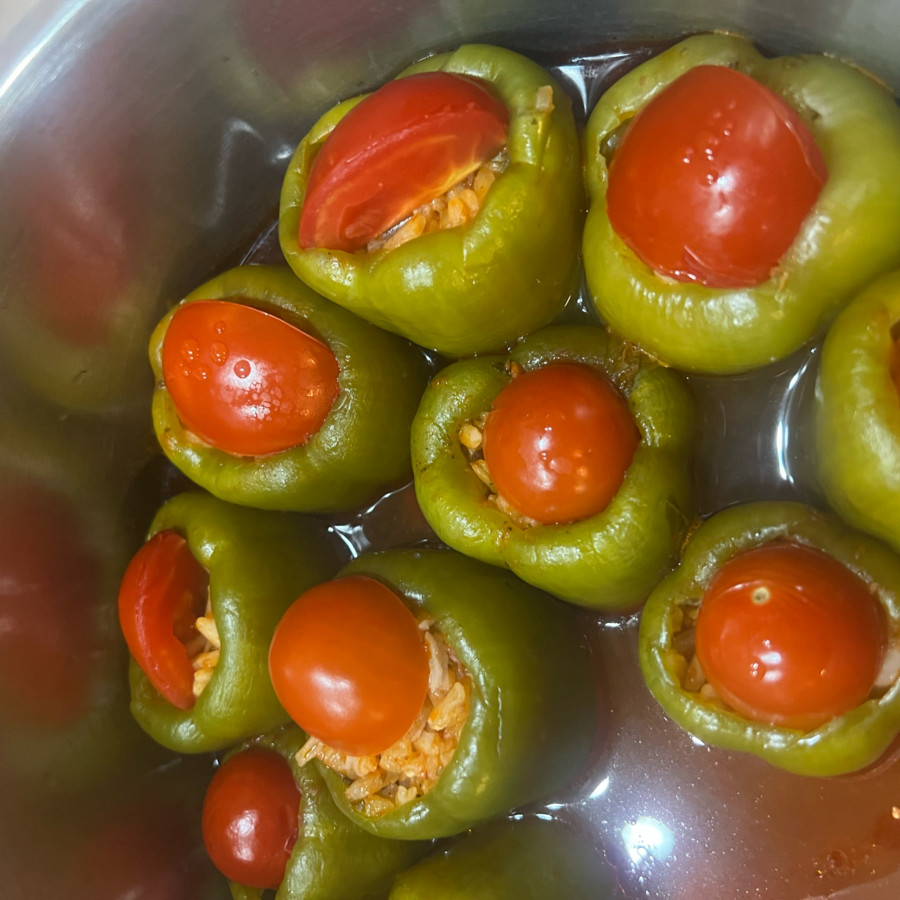 9. Kalan domatesi dilimleyip biberlerin üzerini kapatın,