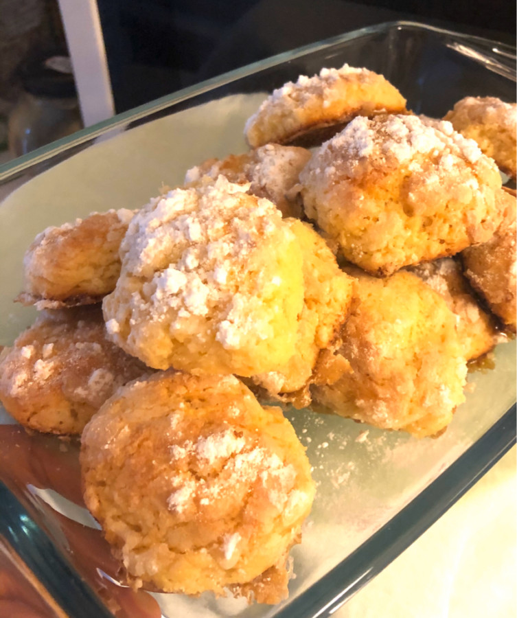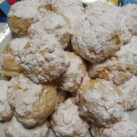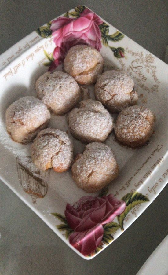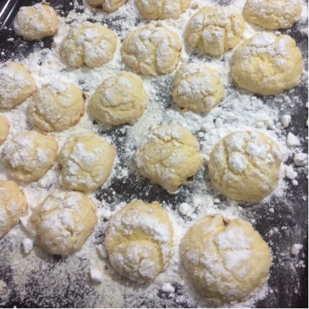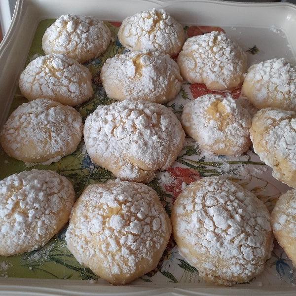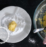 - İki tatlı kaşığı yardımıyla hamurdan küçük parçalar alıp pudra şekerinin içine atın ve her yanı tamamen bulanana kadar içinde iyice yuvarlayın,