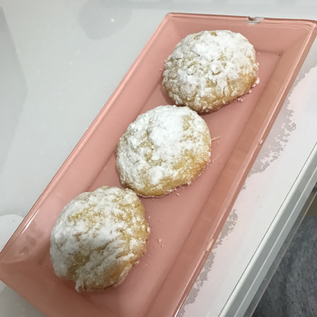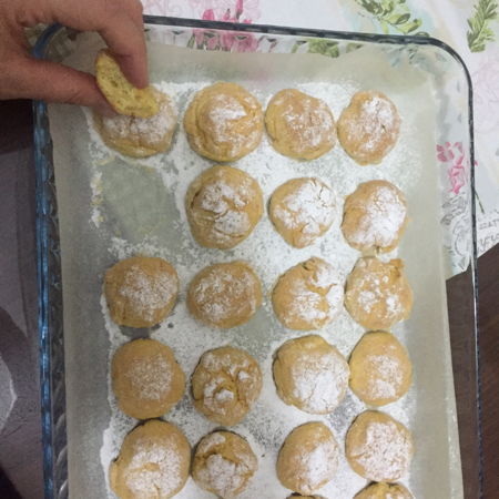 - İki tatlı kaşığı yardımıyla hamurdan küçük parçalar alıp pudra şekerinin içine atın ve her yanı tamamen bulanana kadar içinde iyice yuvarlayın,