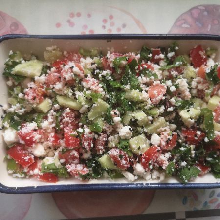 Hazır bugün ve hatta bazıları içi yarın ve sonraki iki gün de tatilken güzel bir kahvaltılık salata tarifi paylaşmak istedim. Benim çok sevdiğim bir kahvaltılıktır bu. Hepsi bir arada diyorum ben buna. Çünkü kahvaltıda yemeyi sevdiğim birçok şey bir arada bu tarifte. Sofrada başka hiçbir şey olmasa yanında bir dilim ekmek olsa yeter.