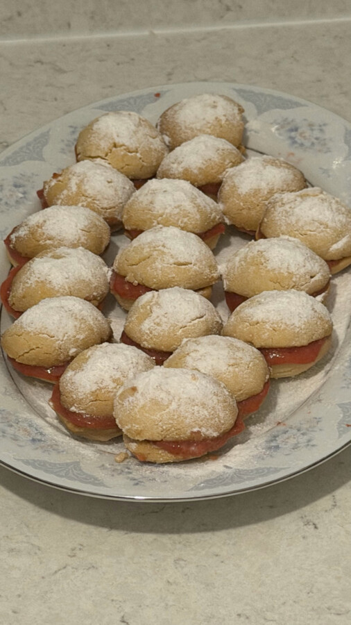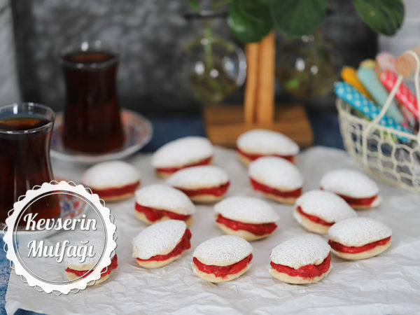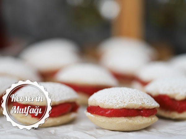 Tarifin aslında arası için marmelat kullanılıyor. Marmelat dediğim de bizim usul marmelat değil, Avrupa ülkelerinin jöle kıvamlı reçeli. Bizim marmelatımız da reçelimizde iki kurabiyenin arasında akmadan durabilecek kıvamda olmadığı için ben nişasta desteğiyle bahsi geçen marmelata yakın kıvamlı bir dolgu hazırladım. Eğer yaşadığınız yerde bahsettiğim reçel/marmelattan bulabiliyorsanız istediğiniz bir çeşidini kullanabilirsiniz.