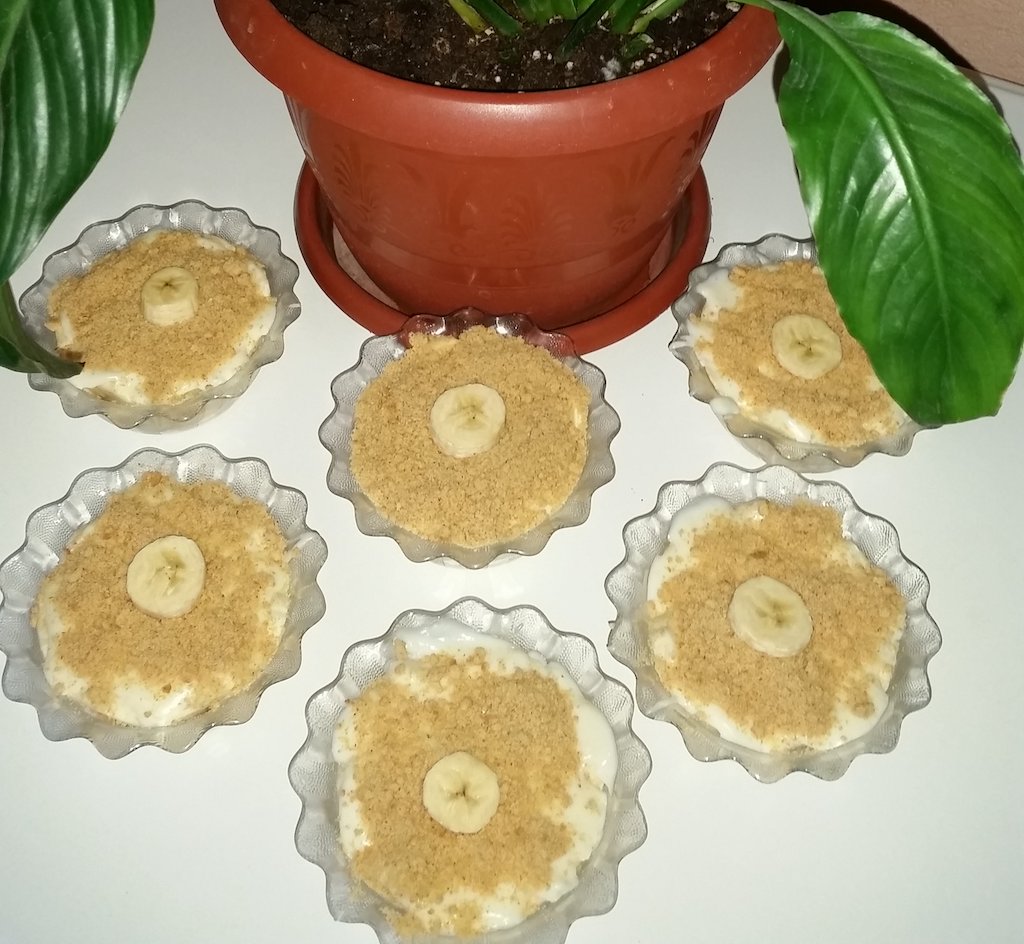 - Bisküvi-muz-puding sırasıyla kaplarınız dolana kadar dizin,