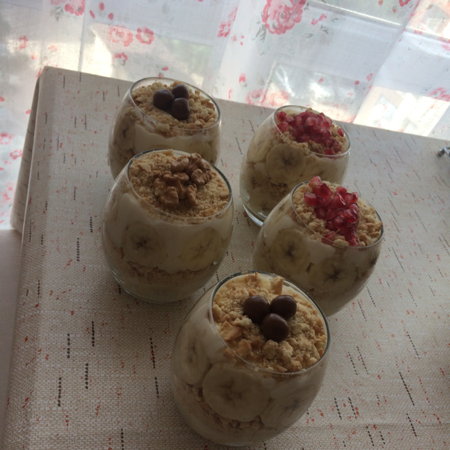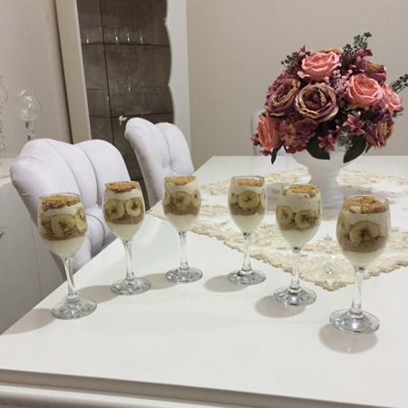 - Bisküvi-muz-puding sırasıyla kaplarınız dolana kadar dizin,
