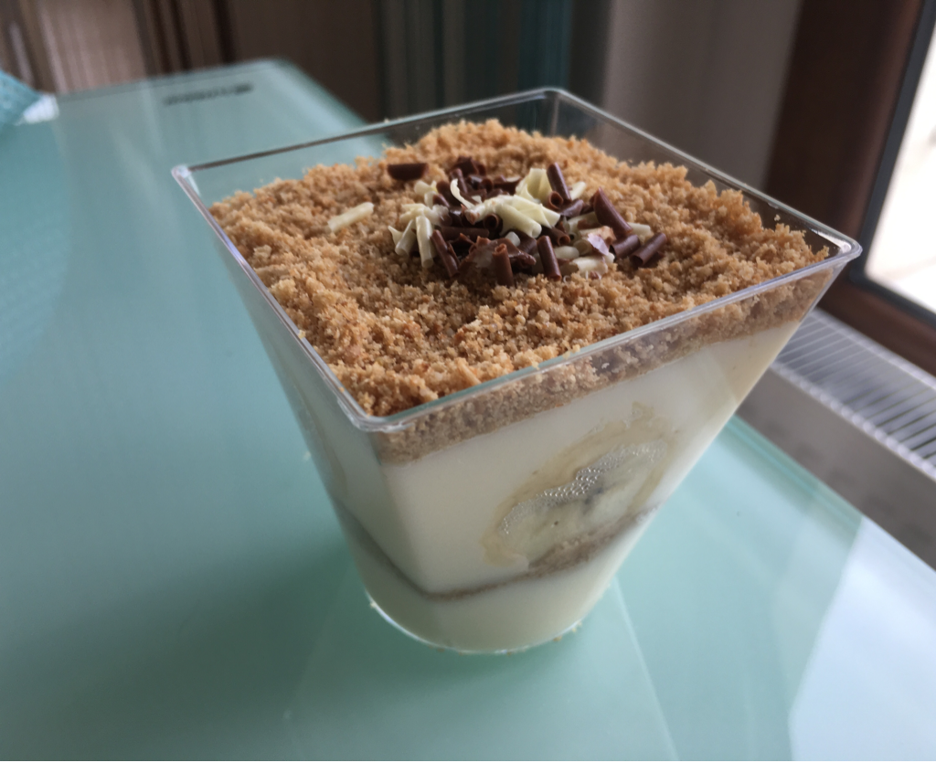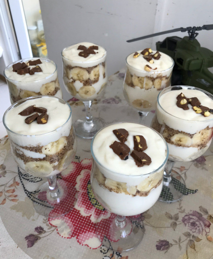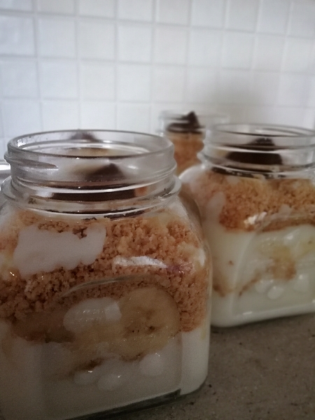 - Bisküvi-muz-puding sırasıyla kaplarınız dolana kadar dizin,