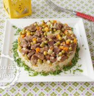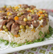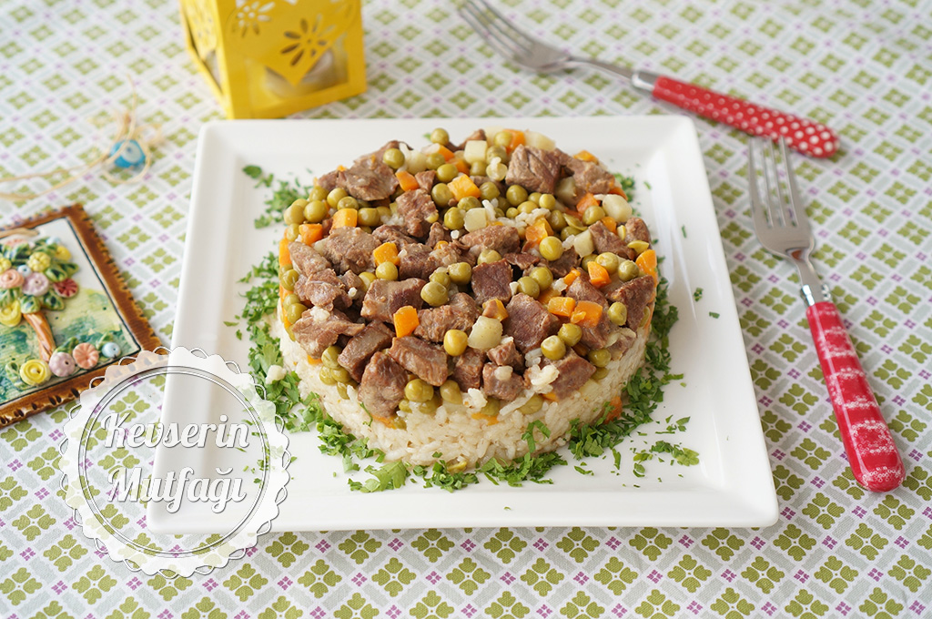 Normalde pirinç-su ölçüsünü 1'e 1,5 şeklinde kullanırım. Ama bu durumda içinde et ve garnitür de olduğu için su miktarını neredeyse iki katı kadar kullandım. Göz kararı yapacaksanız eğer su pirinçlerin üzerini 1 parmak kadar geçiyor. Pirinçlerin tane tane olması için suyu yavaş yavaş çekip, demlene demlene pişmeleri çok önemli. Etleriniz yemeğe eklenmeden önce tam anlamıyla pişmiş olsun, pilavla pişer biraz da diye düşünmeyin. O kadar kısa sürenin etlerin pişimine çok faydası olmayacaktır. Suyunu eklerken sakın ola ki boca etmeyin. Et ve pilav birbirine girer. Tencereye olabildiğince yakın mesafeden yavaş yavaş ekleyin suyunu.