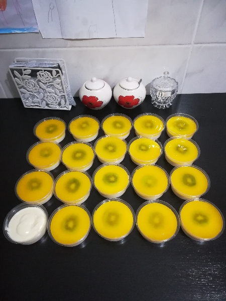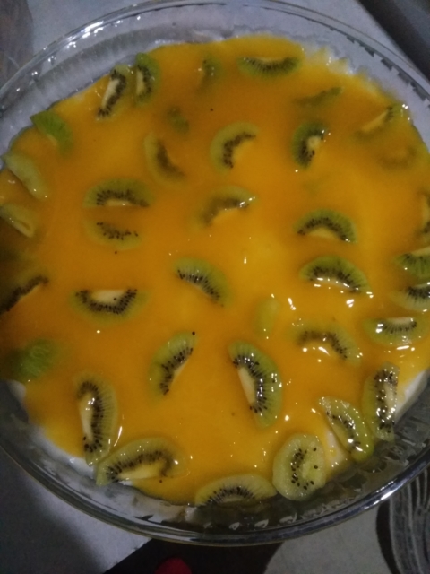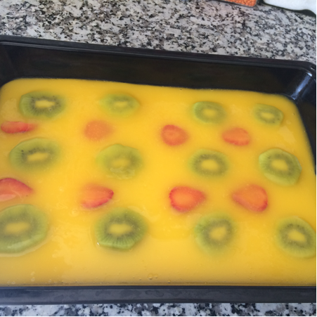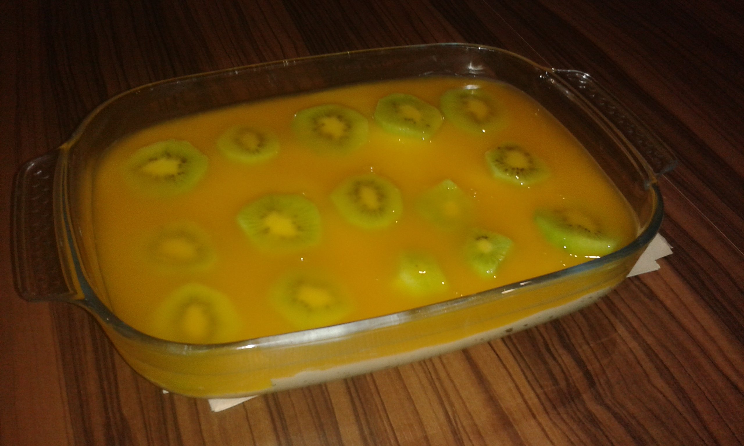 - Karışım soğuduktan sonra üzerine dilimlenmiş kivileri dizin,