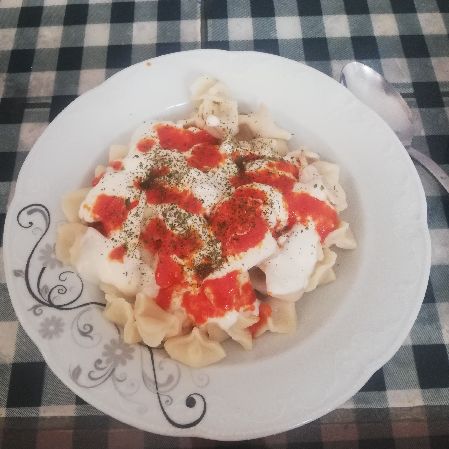 18. Mantınızı tabaklara aldıktan sonra üzerlerine sarımsaklı yoğurt ve onun üzerine salçalı sos döküp istediğiniz baharatları serperek servis yapın.