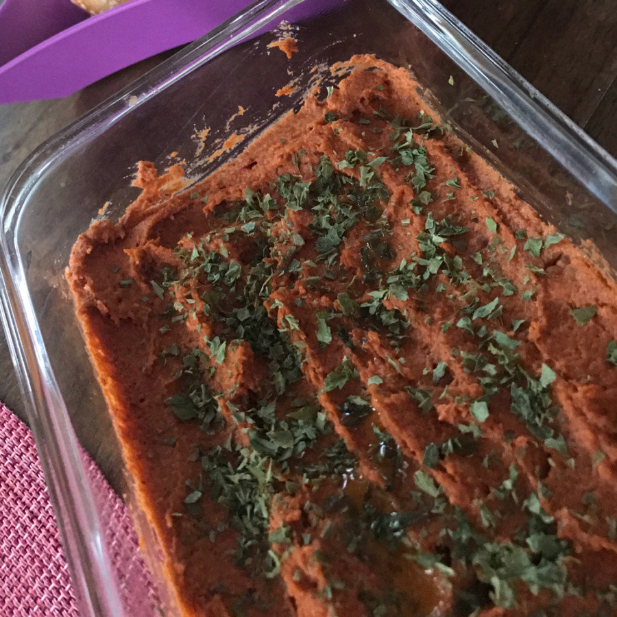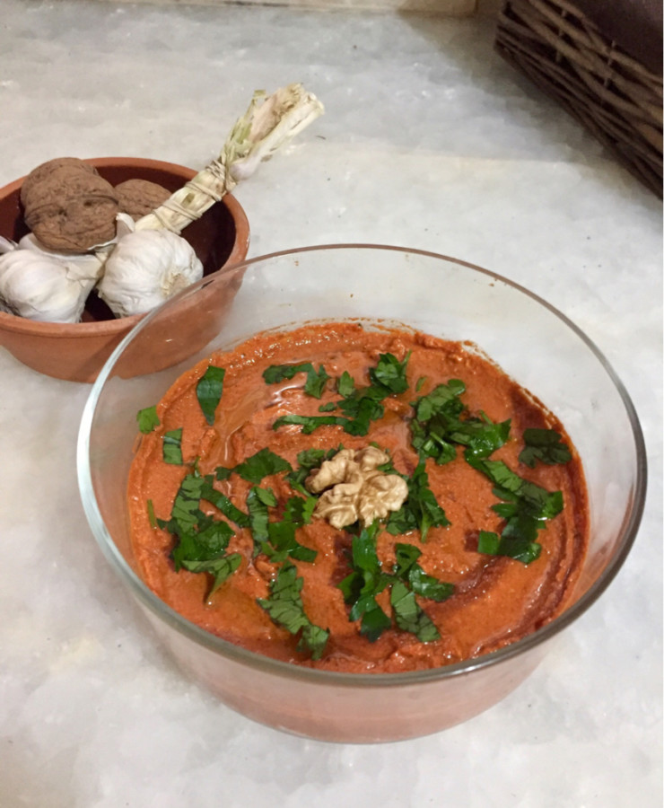 - Közlenmiş biber, sarımsak, salça, zeytinyağ, limon suyu, kimyon ve tuzu ekleyip sürülebilir kıvama gelene kadar çekin,