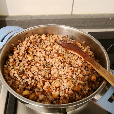 - Nohutu ekleyip karıştırın ve suyunu tamamen çekene kadar pişirin,