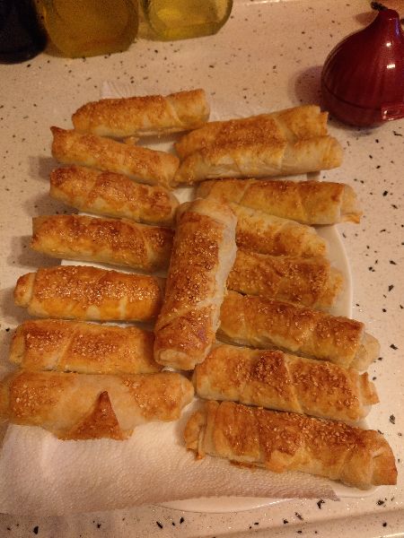 - Parçaların uzun taraflarına patatesli harçtan koyup sigara böreği sarar gibi sarın ve börekleri yağlı kağıt serilmiş fırın tepsisine dizin,