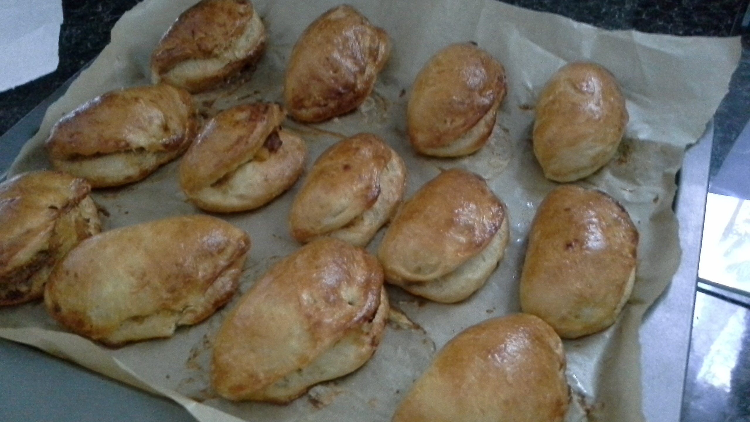 - Hamurdan küçük parçalar koparıp elinizle yassılaştırın ve ortasına yaklaşık 1'er tatlı kaşığı patatesli harç koyun ve kapatarak yuvarlayın ve yağlı kağıt serilmiş bir tepsiye dizin,
