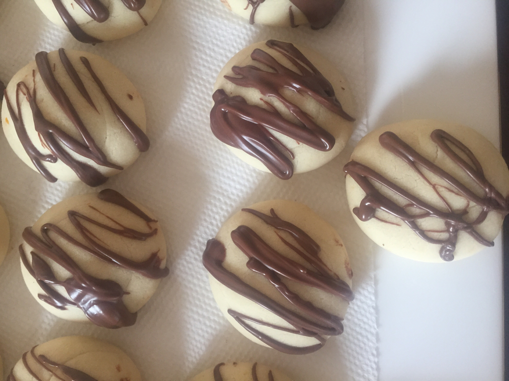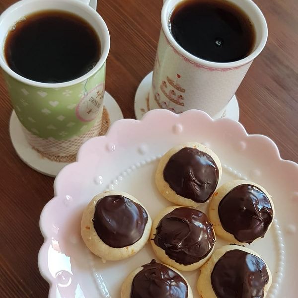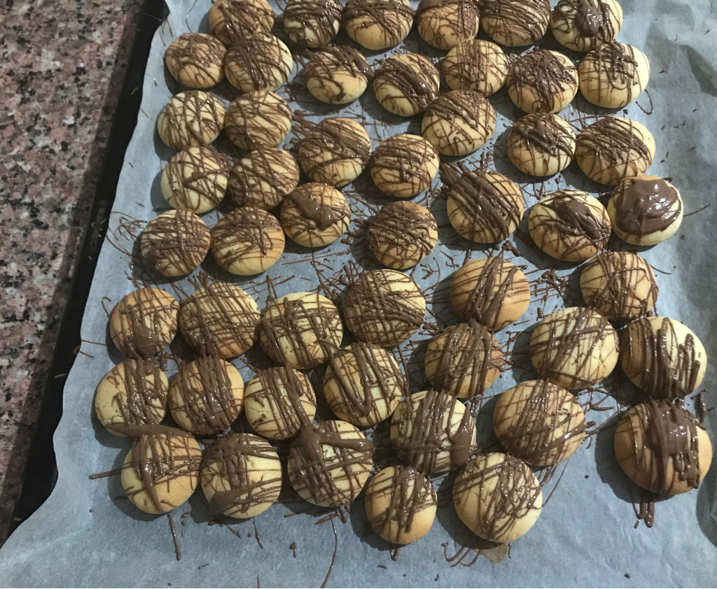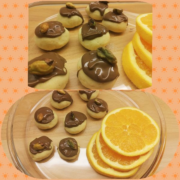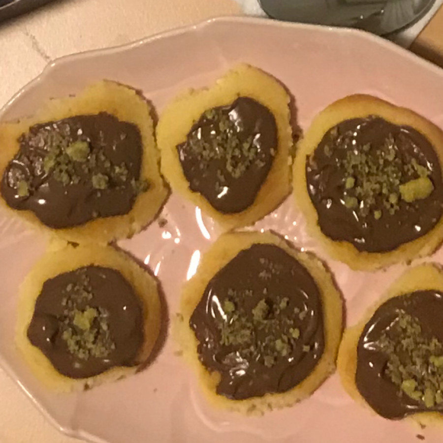 - Çikolatayı bain marie usulü veya mikrodalgada eritip kurabiyelerin üzerine paylaştırın ve antep fıstığı ile süsleyin.