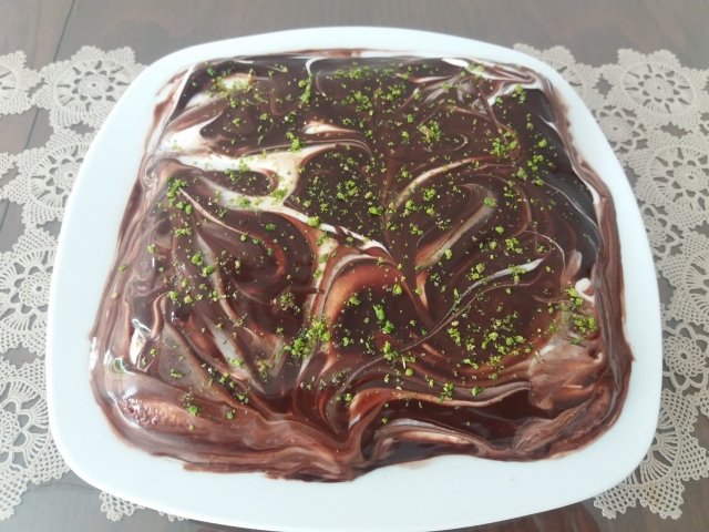 - Kremanın üzerine çikolata sosunu gezdirin ve bir kaşığı sırtıyla fazla bastırmadan düzleyin