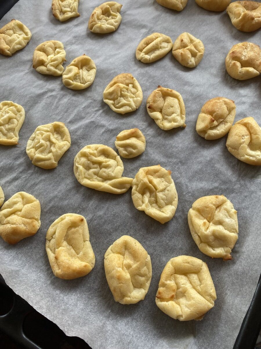 8. Hamuru sıkma torbasına koyup pişirme kağıdı serdiğiniz tepsiye aralıklı olarak 3'er cm'lik toplar sıkın,