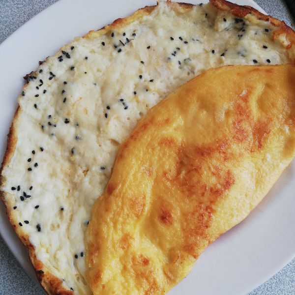 Yumurta akları tıraş kıvamına gelecek kadar çırpılıp köpürtüldükten sonra diğer malzemelerle karıştırılıyor. Bu aşamada karışımın köpüksü ama akışkan bir kıvamı oluyor. Karışım tavaya döküldükten sonra altı kısa sürede kızarıp güzel bir renk alıyor. Ama üstü hala akışkan kıvamda oluyor. Omleti ikiye katladığınızda da böyle bu. İçi, katlama aşamasından sonra pişiyor. Üstü hala akışkan kıvamda olduğu ve oldukça kalın olduğu için katladıktan sonra sabit şekilde durmuyor, durması birleşim yerinin ve içinin de pişmesi için arkasından bir spatulayla desteklemek gerekiyor. Ama merak etmeyin çok kısa sürede pişiyor.