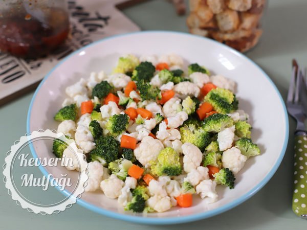Bu salata bana çok sevdiğim eski komşum rahmetli Seyhan Ablamdan yadigardır. Bir gün gittim salata yiyor. Ben de çok severim karnabaharı, brokoliyi derken baktım çiğ çiğ doğramış yiyor. Bunlar böyle de mi yeniyor derken bir parça brokoli attım ağzıma ki o ne lezzet. Yıllardır niye haşlamaya uğraşmışım ben bunları diye epey hayıflanmıştım.