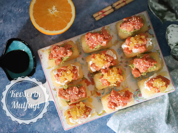 Pirinçleri kızarttıktan sonra sıra üst malzemelerine geliyor. Ben suşi yapımı için satılan somon kullandım. Eğer bulabilirseniz aynısını kullanabilirsiniz. Bulmanız mümkün değilse nispeten daha yaygın satışı olan somon füme kullanabilirsiniz. Acı sos, mayonez, soya sosu vs. ile birleşinde somon inanılmaz bir lezzete kavuşuyor. Pirinci kızartmakla uğraşmak istemeseniz bile bu karışımı yapıp kızarmış minik ekmek dilimleri üzerinde servis edebilirsiniz.