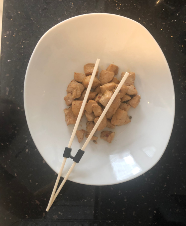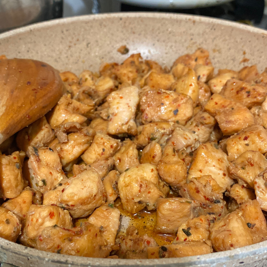 - Tavuk göğsünü kuşbaşı doğrayıp bir kaseye alın,