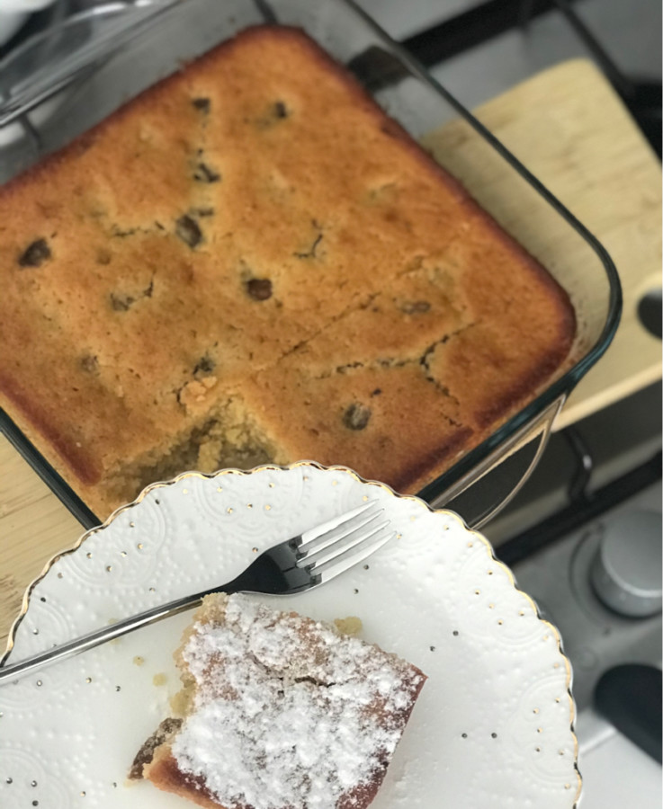 Kek yumurta içermediği için çok dağılgan yapıda oluyor, özellikle de iyi piştiğinde. Kenar kısımları da biraz sert oluyor yine iyi piştiğinde. O yüzden ben kürdan testinde kürdanın üzerinde ıslak parçalar kalmış, içi hala hafifçe ıslak halde çıkarıyorum fırından. Bu şekilde ıslatılmadan ıslak kek oluyor. Ama bu kıvamı ayarlamak biraz zor açıkçası. O yüzden ekstra özen gösterin pişirme aşamasında. Üzerinin tamamen kızarmasını beklemeyin kürdan testi için. Kabuk bağlayıp pembeleşmesi kürdan testi ve hatta belki de fırından almanın zamanının geldiğini gösterir.