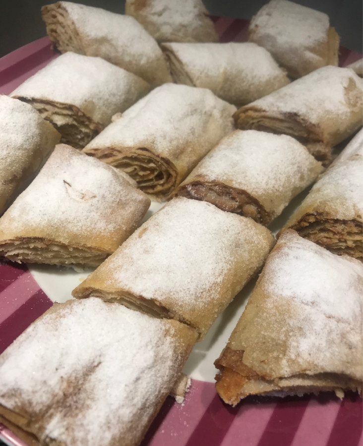 - Kalan malzemeleri de aynı sırayla (yufka-tereyağ,yufka-tereyağ-yufka-tahin+bal+ceviz) hazırlayıp rulo şeklinde sarın ve birbirine değmeyecek şekilde tepsiye dizin,