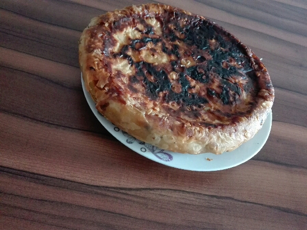 - Diğer yufkanın üçte birini koparıp rastgele tavaya yerleştirin,