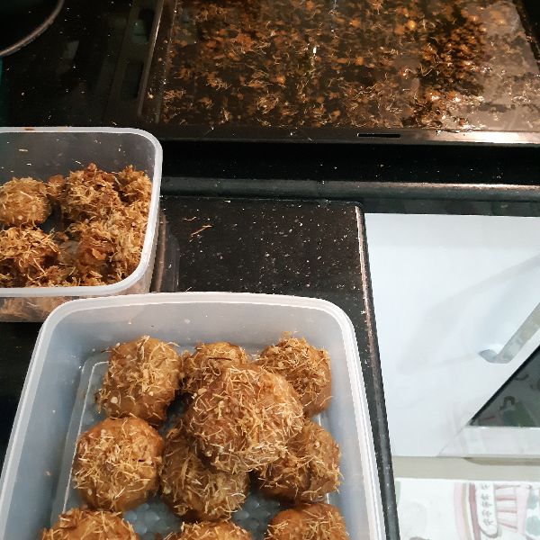 - Topları avucunuzun içinde açıp ortalarına 1 tatlı kaşığı kadar cevizli harçtan koyup kapatın ve yuvarlayın,