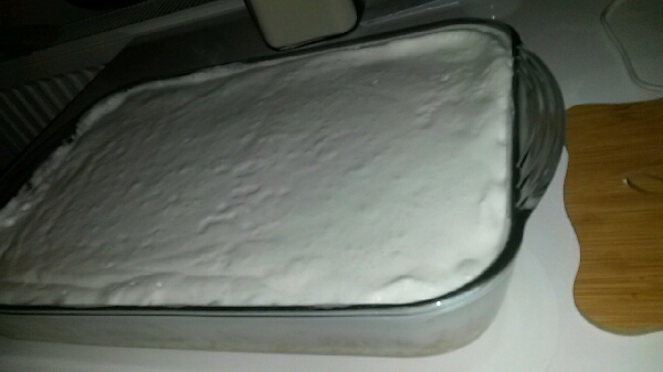 - Kek soğuduktan sonra derin bir kapta şerbeti için süt ve süt tozunu köpürene kadar çırpın,