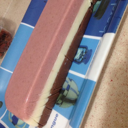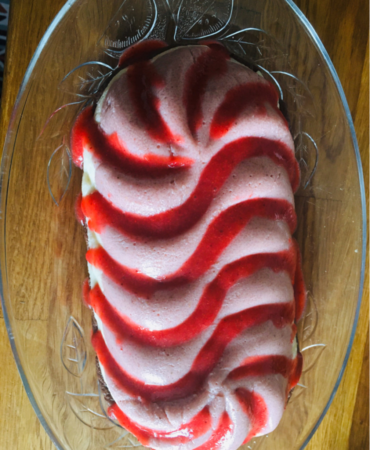 - Hiç bekletmeden çilekli katın üzerine döküp üzerini düzleyin,