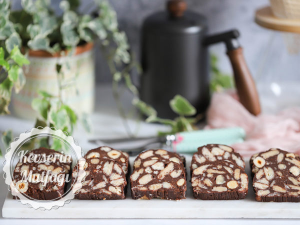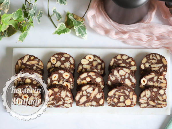 Sadece bisküvi, çikolata, su ve fındık kullanılıyor. Ben bisküvi ve çikolatanın şekerinin yeterli geldiğini düşündüğüm için ekstra şeker eklemedim ama eğer tatlıları çok şekerli seviyorsanız ekstra şeker de ekleyebilirsiniz.