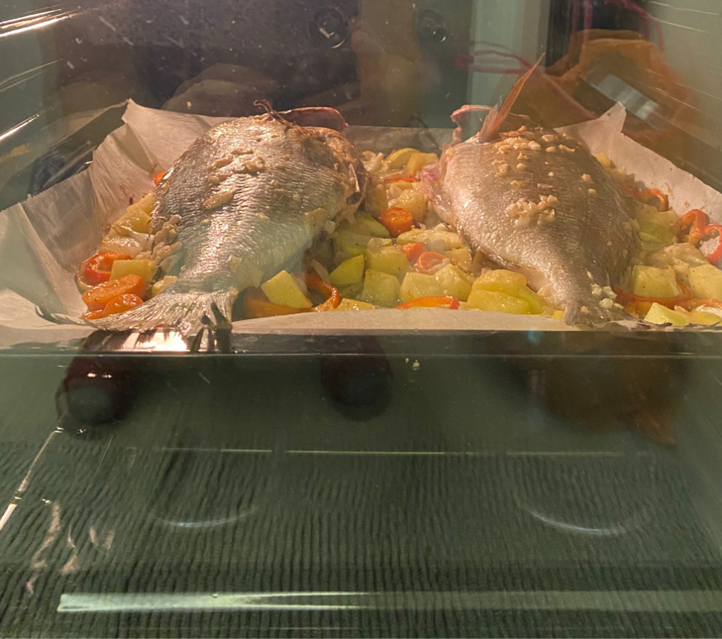 - Defne yapraklarını balıkların içine yerleştirip balıkları tepsideki sebzelerin üzerine yatırın,