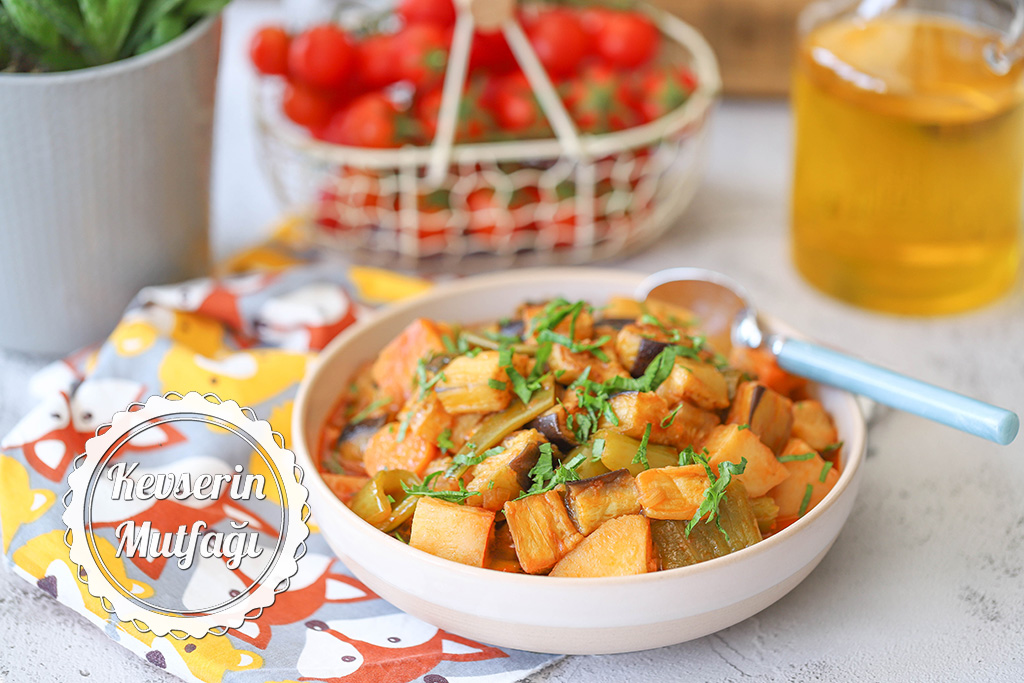 Bütün sebze yemekleri gibi türlünün her çeşidini çok severim. Etlisi, kıymalısı hepsi güzeldir. Ama vegan yaz türlüsü bir başka lezzetli oluyor sanki. Belki de içindeki sebzelerin taptaze olduğunu bilmek yemekten daha çok keyif veriyor bana. Ben evde olan sebzelerle aşağıdaki tarifi uygulayarak yapıyorum genellikle. Ama zaman zaman elimdeki malzemelere göre değişikliğe uğradığı oluyor. Sizler de bu sebzeleri renkli biberlerle, taze bezelyeyle, vs. çeşitlendirebilirsiniz.