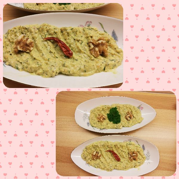 - Ilındıktan sonra içine ezilmiş sarımsakları, cevizi, dere otunu, tuzu ve yoğurdu ekleyip karıştırın,