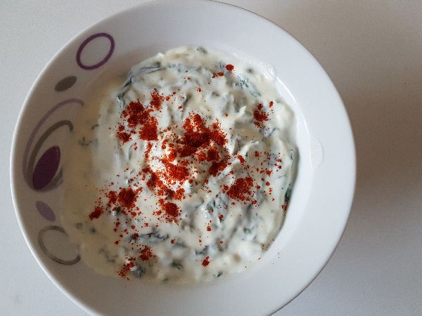 - Ayrı bir kapta yoğurt, tuz ve ezilmiş sarımsakları çırpın,